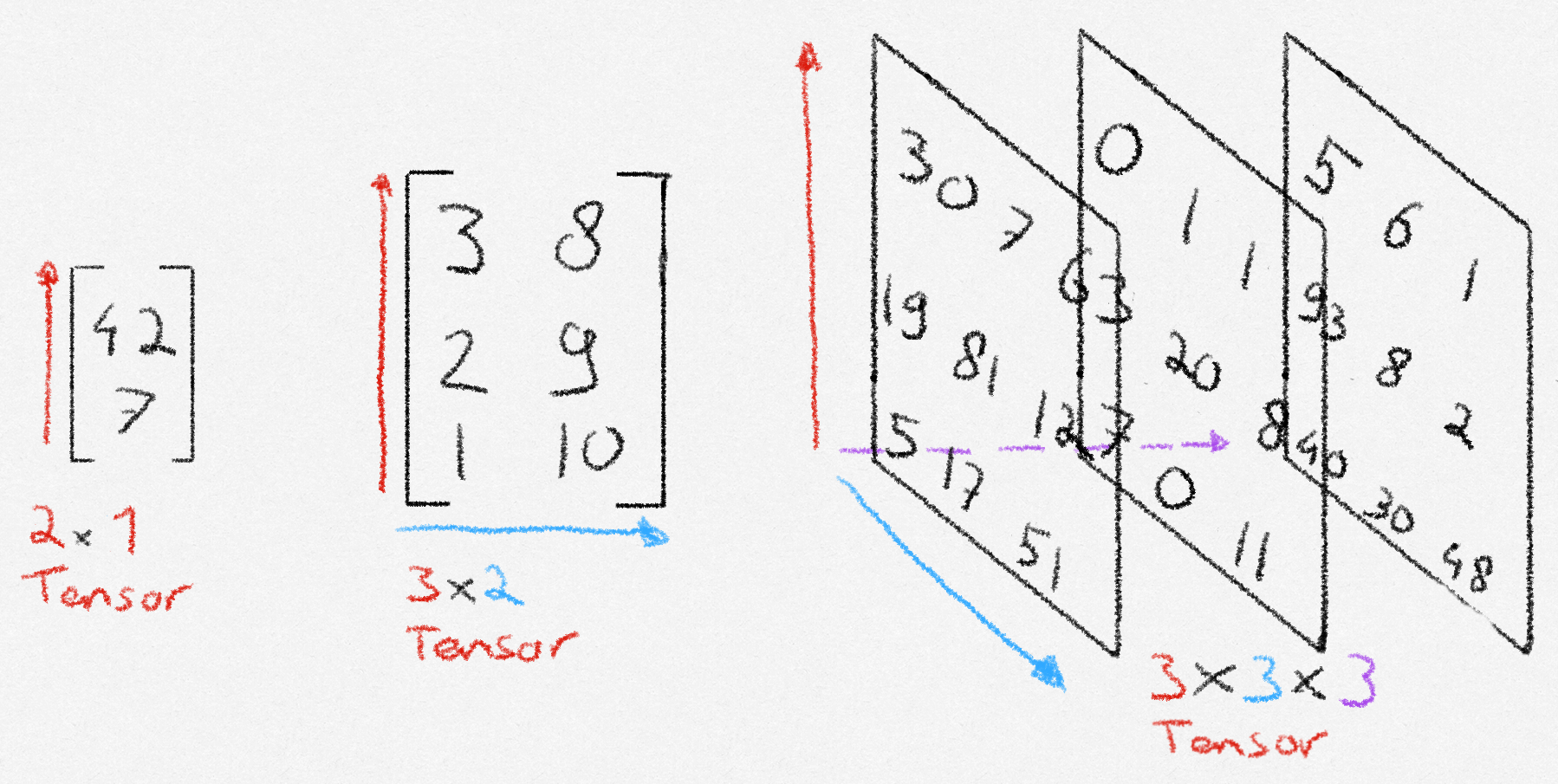 If you are familiar with math, it might help to think about a tensor as an n-dimensional matrix. If you are not familiar with math, or just want a better explanation, you can think of a tensor as a collection of structured numbers that we can do quick math with. A tensor has two properties: shape, and dimension. Shape means how many numbers the tensor has along each axis. Dimension means the amount of axes that the tensor has. In the picture below, the dimension corresponds with the number of colored arrows, and the shape is denoted below the tensor.
